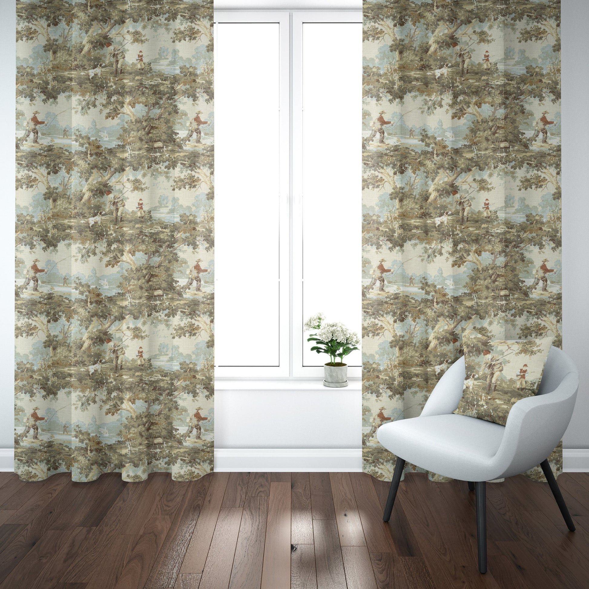 Create a cozy mood with vintage scenes of hunting and fishing on a soft linen blend fabric.