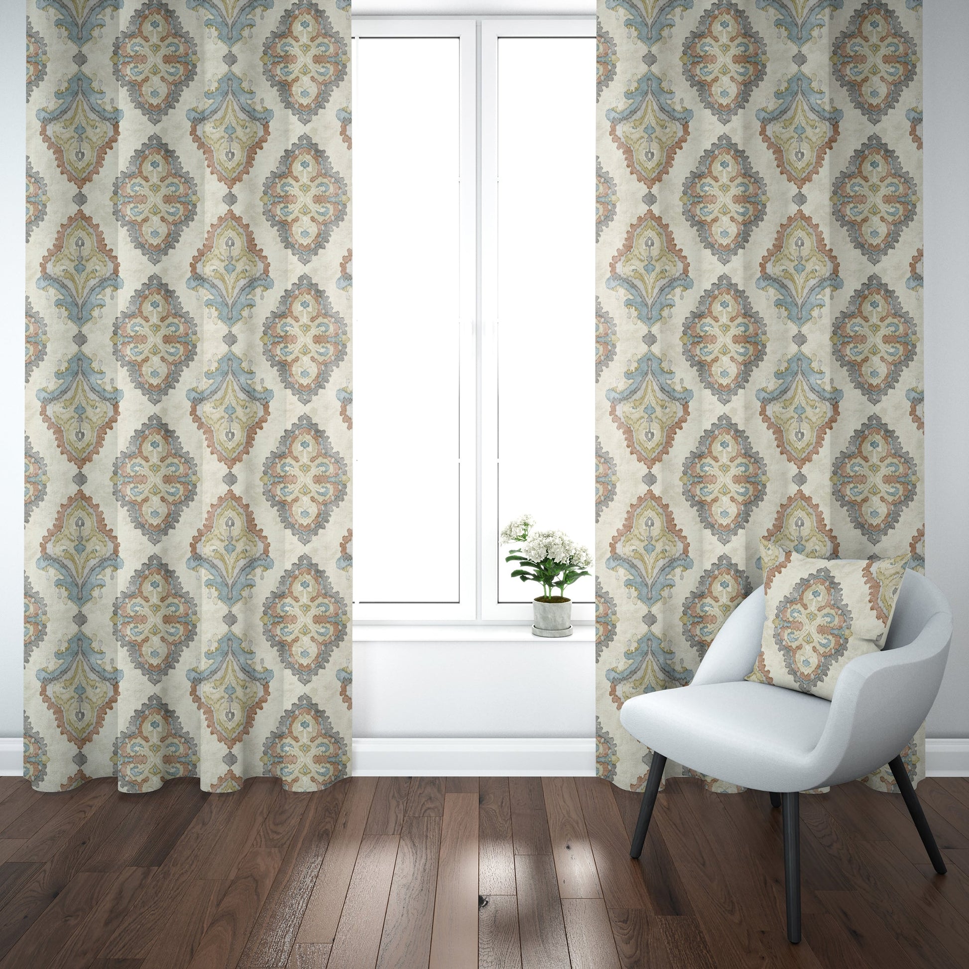 Back Tab Curtain Panels Pair in Queen Tuscan Blue and Coral Medallion Watercolor- Large Scale