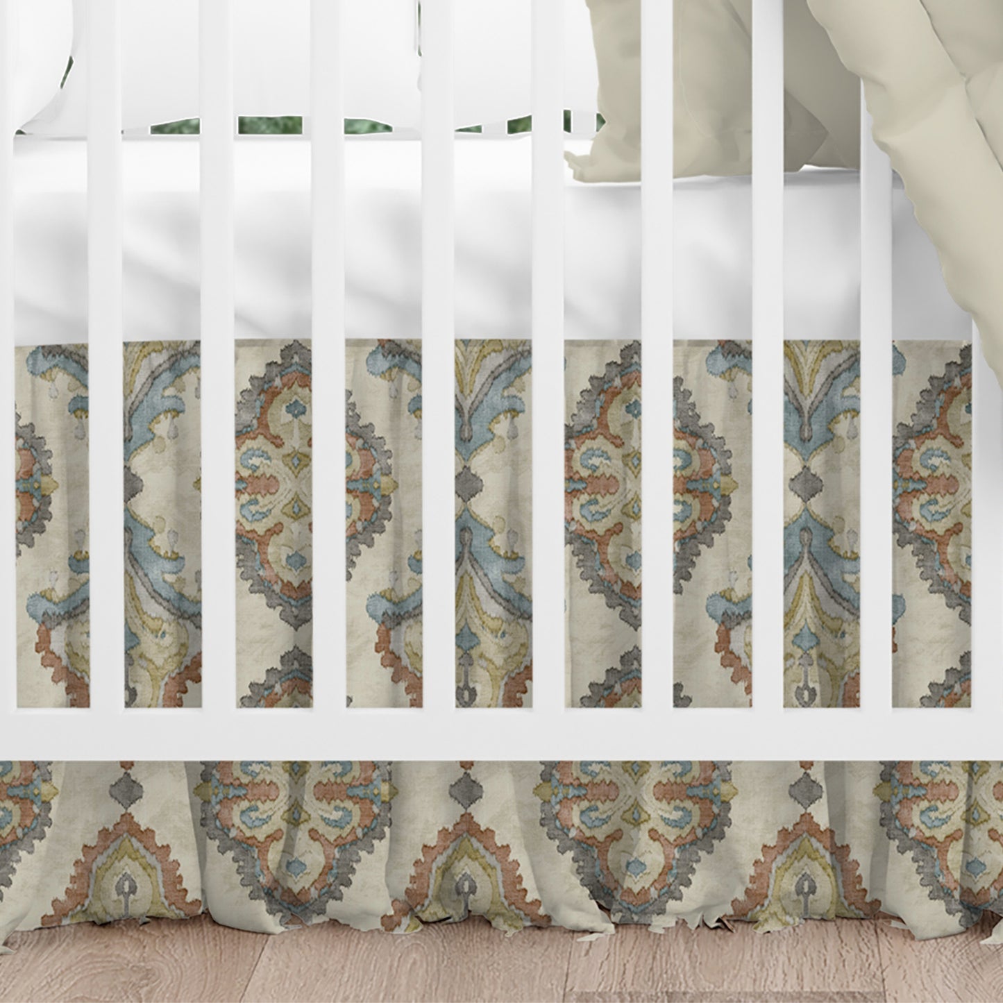 Gathered Crib Skirt in Queen Tuscan Blue and Coral Medallion Watercolor- Large Scale