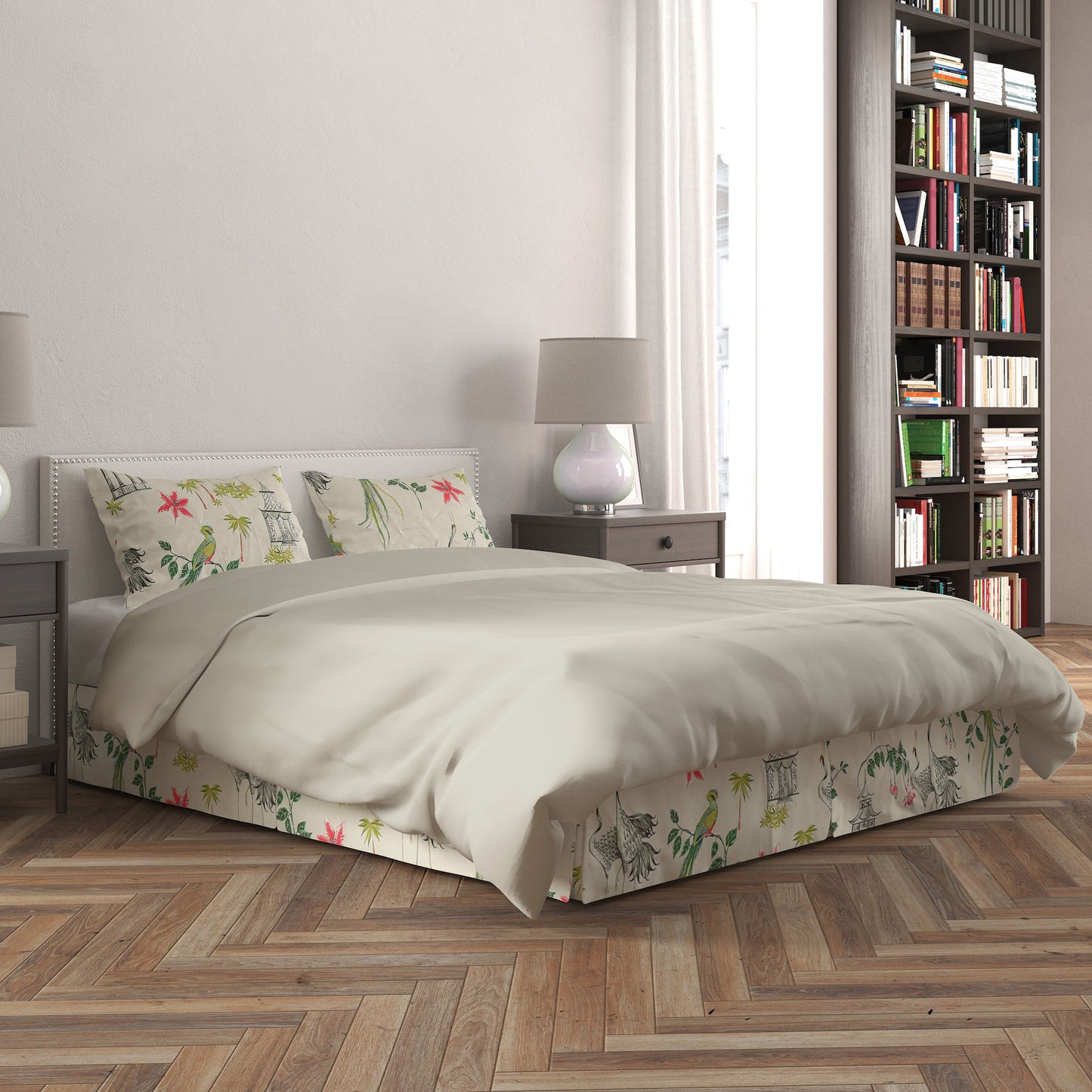 Tailored Bedskirt in Let It Crane Avocado Oriental Toile, Multicolor Chinoiserie